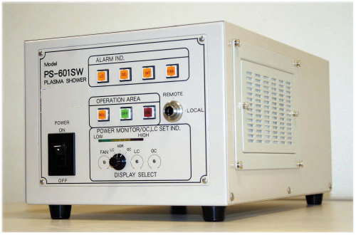 当プラズマ照射装置(プラズマシャワー照射装置による基材表面改質(処理)専用機)は、高電圧プラズマ放電と空気(エアー)を用い大気中で、プラズマ放電を発生させます。